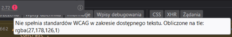 Na stronie szkoleniedlaqa.pl/404 pewien element ma kontrast 2.72. Nie spełnia to WCAG.